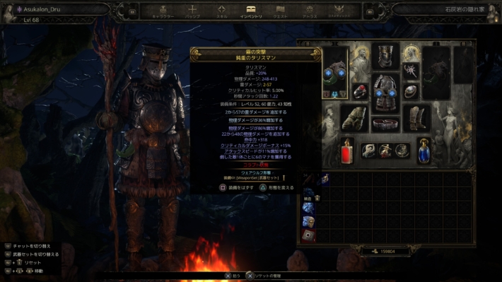 レベルは68。ここからPoE2の本番が始まるわけですが、おおよそレベル90くらいでT15が回れるような形になるようにやっていきたいですね。